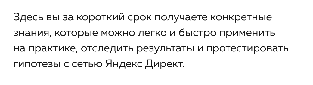 Но если вы выбрали свой проект, то советуем выделить бюджет на рекламу от 3000 руб — это поможет собрать достаточно статистики, чтобы оценить результат и оптимизировать рекламные кампании, а еще сразу получить практический опыт и обратную связь от кураторов. Это значит, что вы сможете сделать хороший результат для своего клиента прямо на курсе, не дожидаясь его окончания.